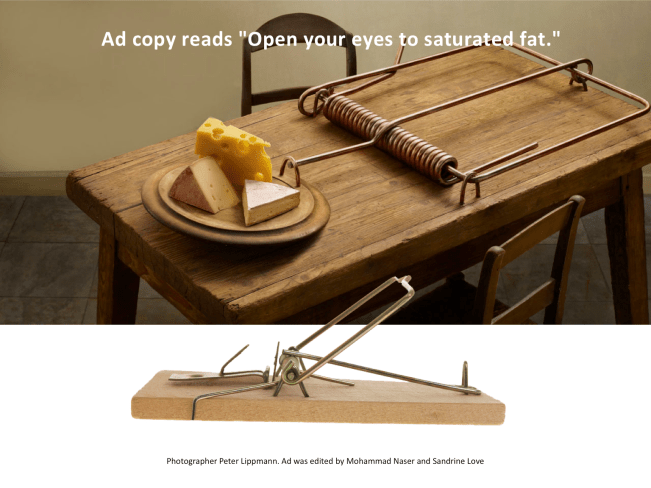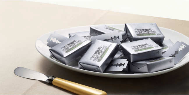Notice the razor blades next to the butter, which are somewhat camouflaged. Is eating butter, even regularly, akin to eating razor blades? The ad copy reads, “Open your eyes to saturated fat.” Imagine if you swallowed a razor blade? The message appears to be clear – eating butter is dangerous, and may even kill you. Does butter cause disease? On the contrary, butter from grass-fed cows protects us against many diseases. Read our article, In defense of butter.
