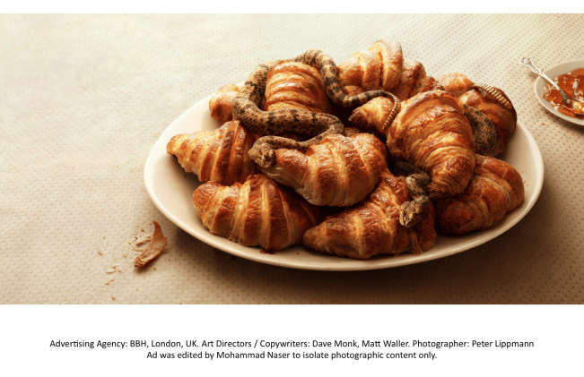 This is the last of the edited photographs used in this ad series of 4 that were created. In this case, we are actually more in agreement. The typical ingredients in a croissant are unbleached all-purpose flour, cold water, cold whole milk, granulated sugar, soft unsalted butter and an egg for an egg wash. While we would certainly not equate eating croissants to being as dangerous as picking up food from a plate with poisonous snakes, croissants aren’t a nutrient dense food.
